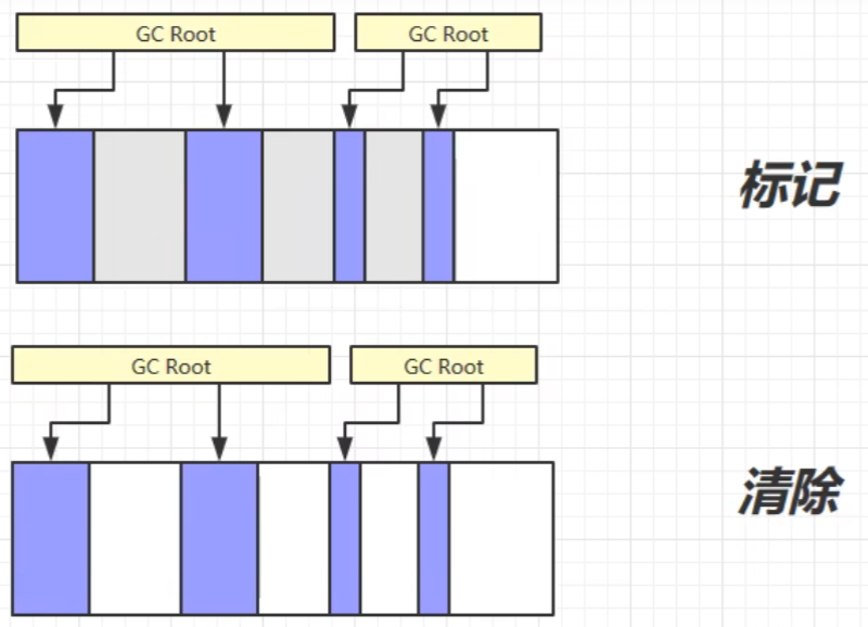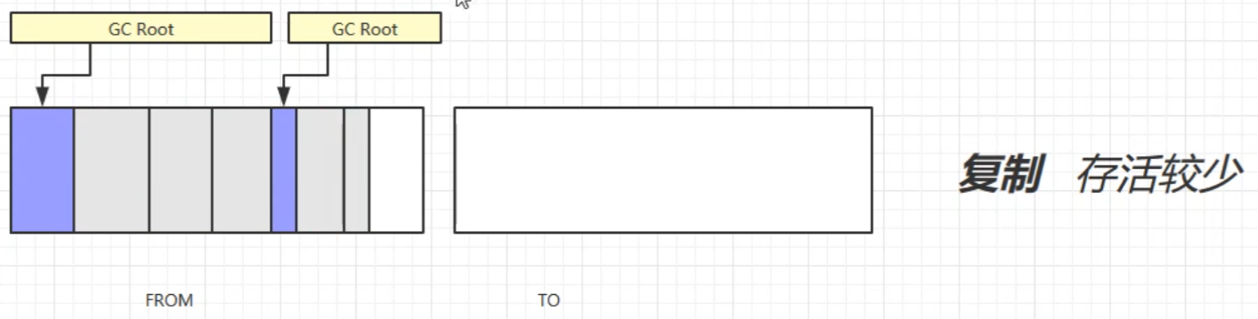 扫描沿着 GC Root 扫描新生代内存(伊甸园区和From区),进行垃圾标记,将幸存对象复制到To区,幸存对象寿命+1,清除From区,然后交换From和To区。