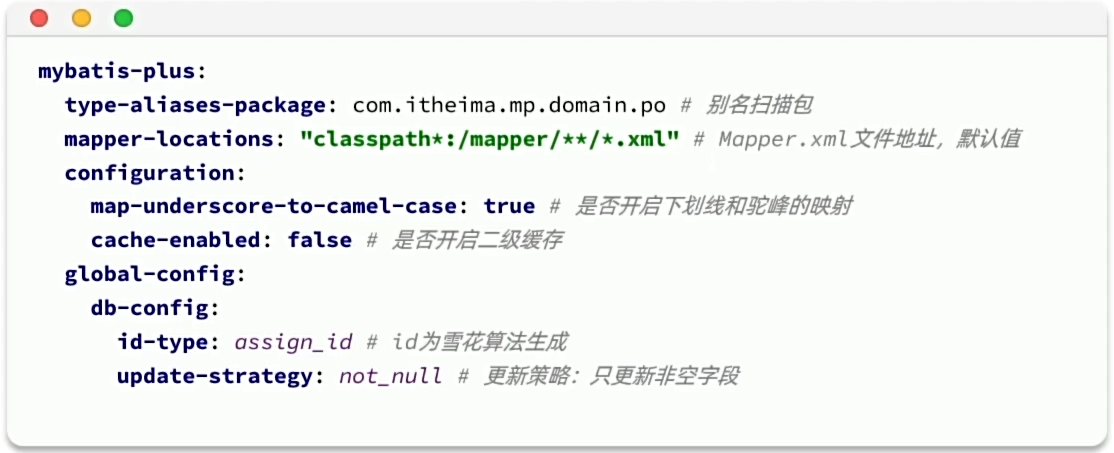 id-type默认值为ASSIGN_ID,当和注解配置@TableId同时存在时,注解的优先级更高。如果没有注解,默认使用这里的id-type配置。update-strategy默认值就是not_null,在更新数据时,只更新非null的字段。