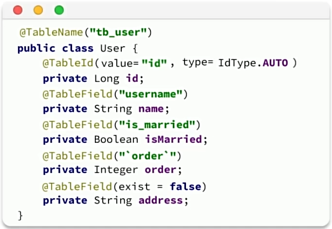 注解的作用:告诉MybatisPlus,数据库中的字段是怎样定义的。